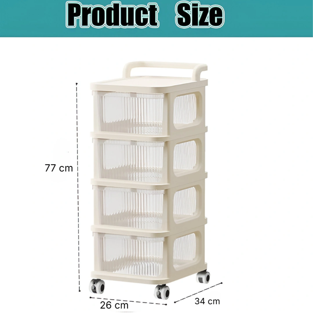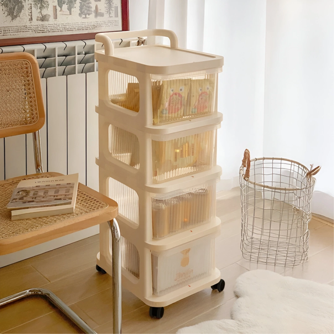 Multiple transparent front drawers provide organized storage for clothes accessories kitchen tools cosmetics or daily essentials.