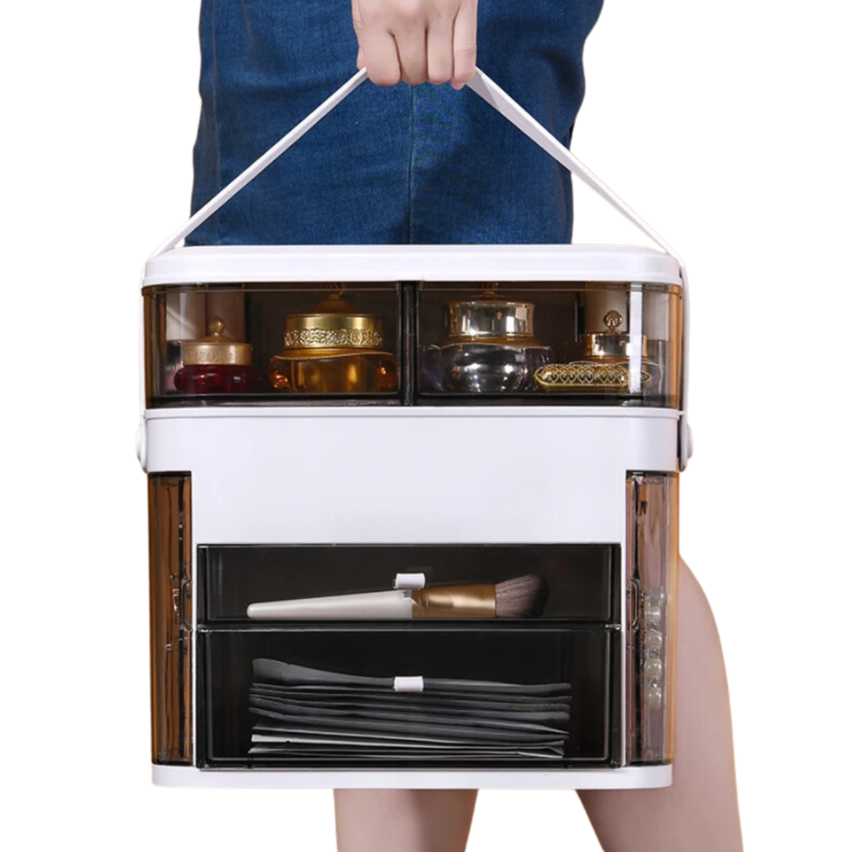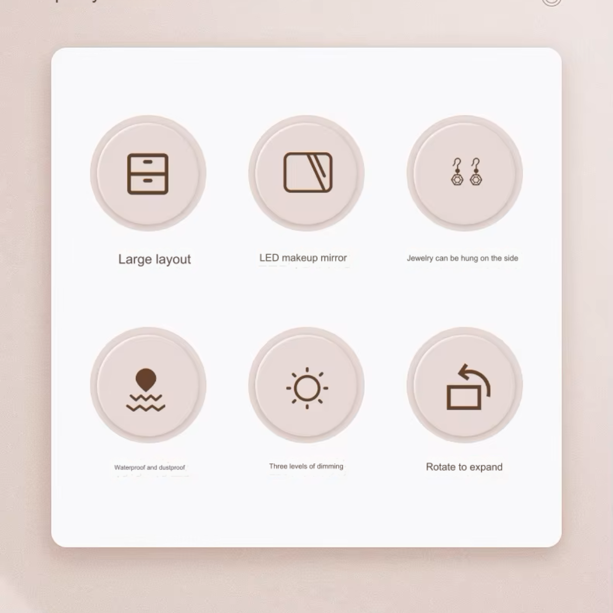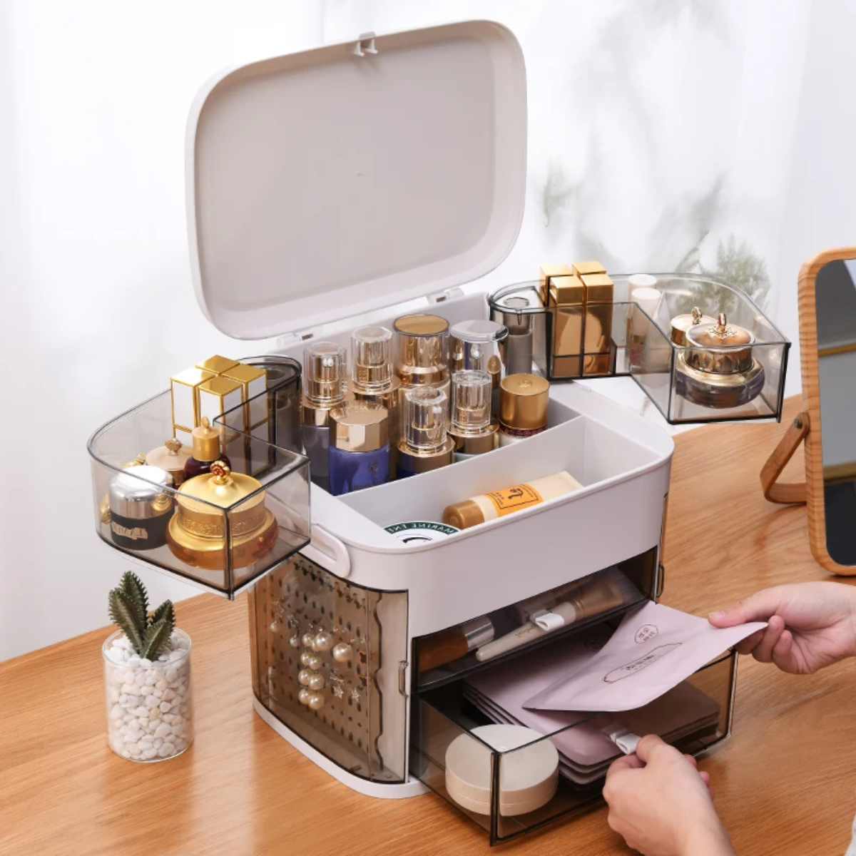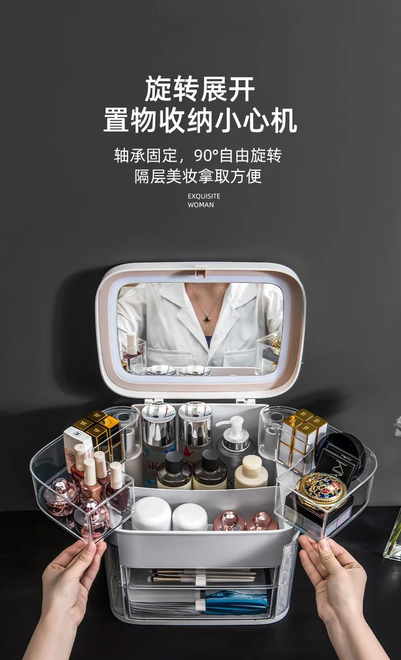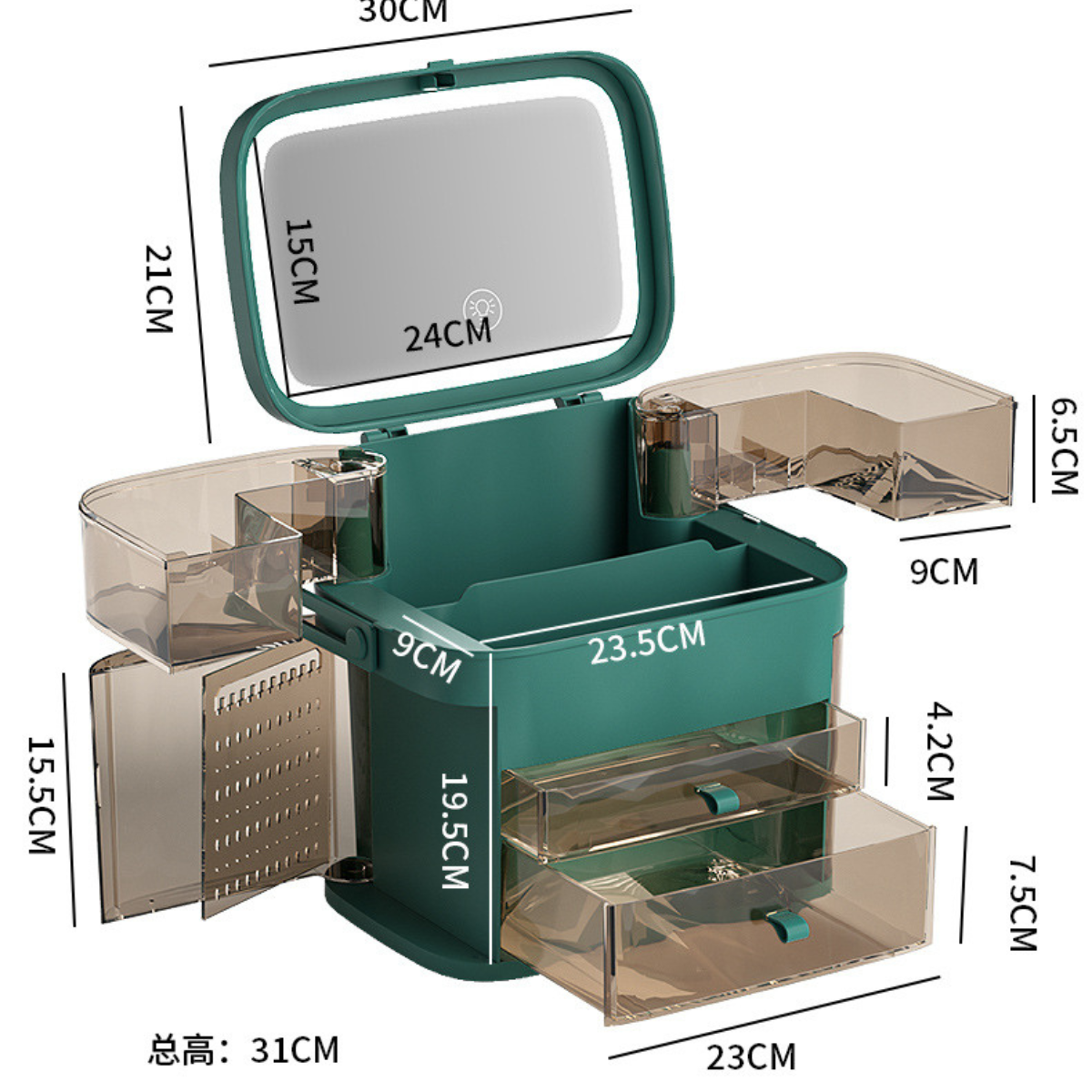 • Ample Storage Space: Separate compartments for cosmetics, jewelry, and skincare products.