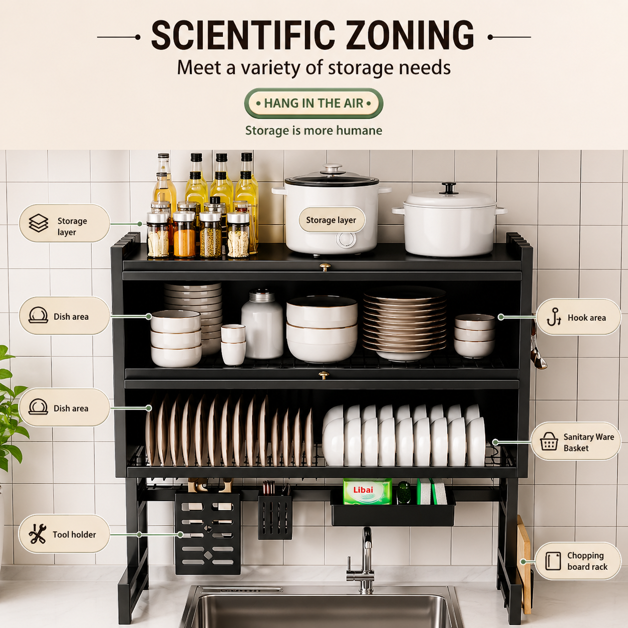 A smart and space-saving solution designed to keep your kitchen organized and efficient. This modern rack combines durability with functionality, making it perfect for storing dishes, utensils, and cleaning essentials in one place.