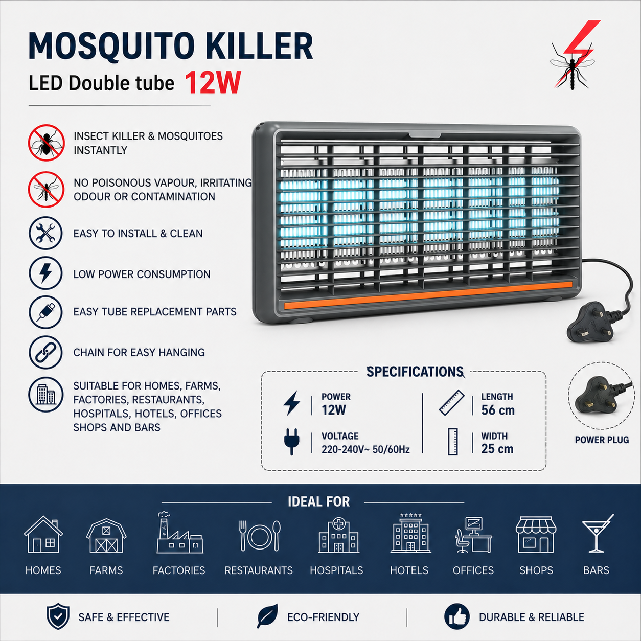 Eliminate mosquitoes and flying insects instantly with this powerful electric insect killer.