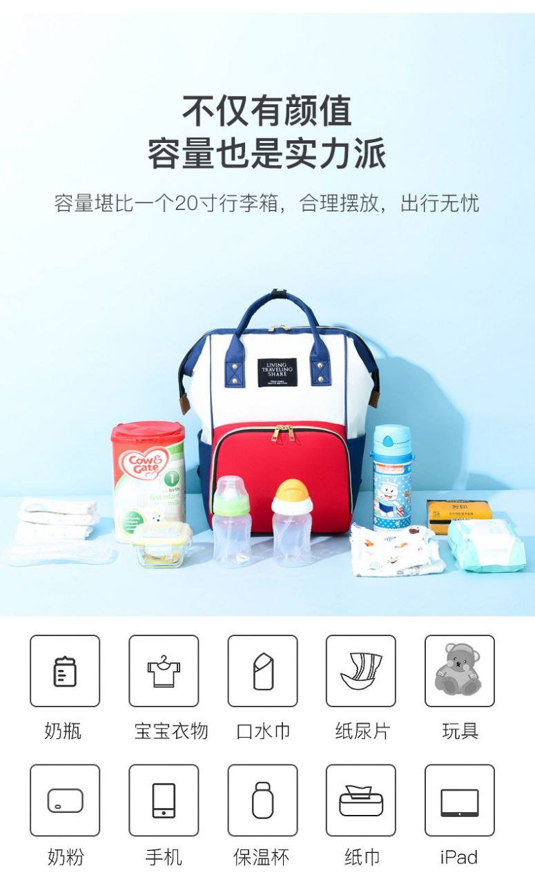 • Large capacity to hold diapers, bottles, clothes, and personal items.
