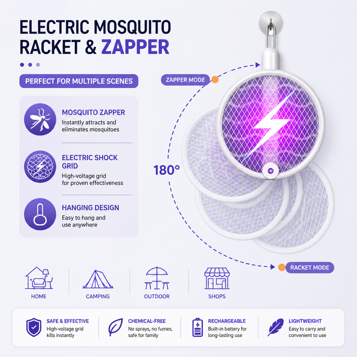 Say goodbye to annoying mosquitoes and insects with this advanced 2-in-1 electric mosquito racket. Combining powerful electric shock with UV light attraction, it ensures efficient and safe insect control for both indoor and outdoor use.