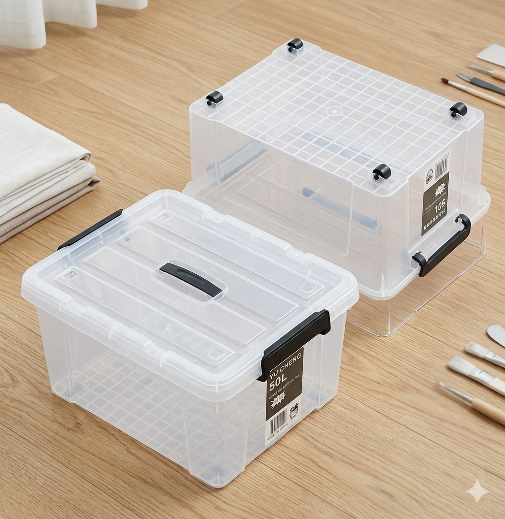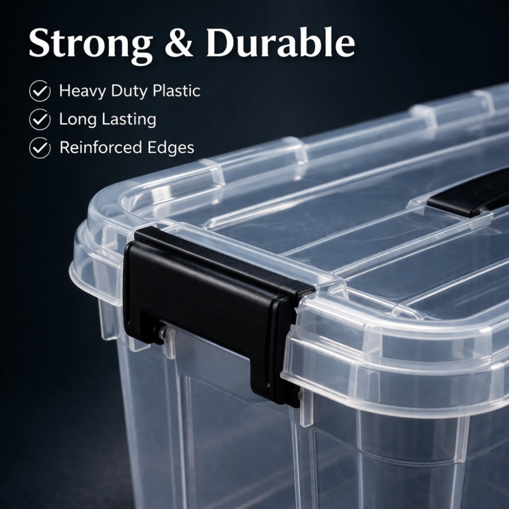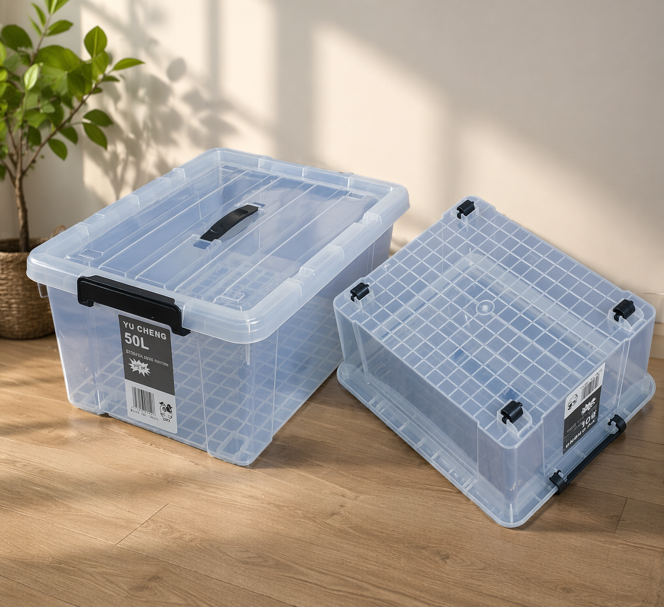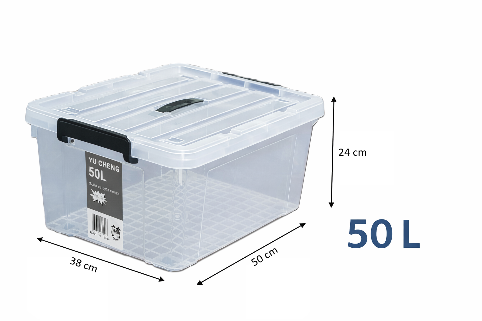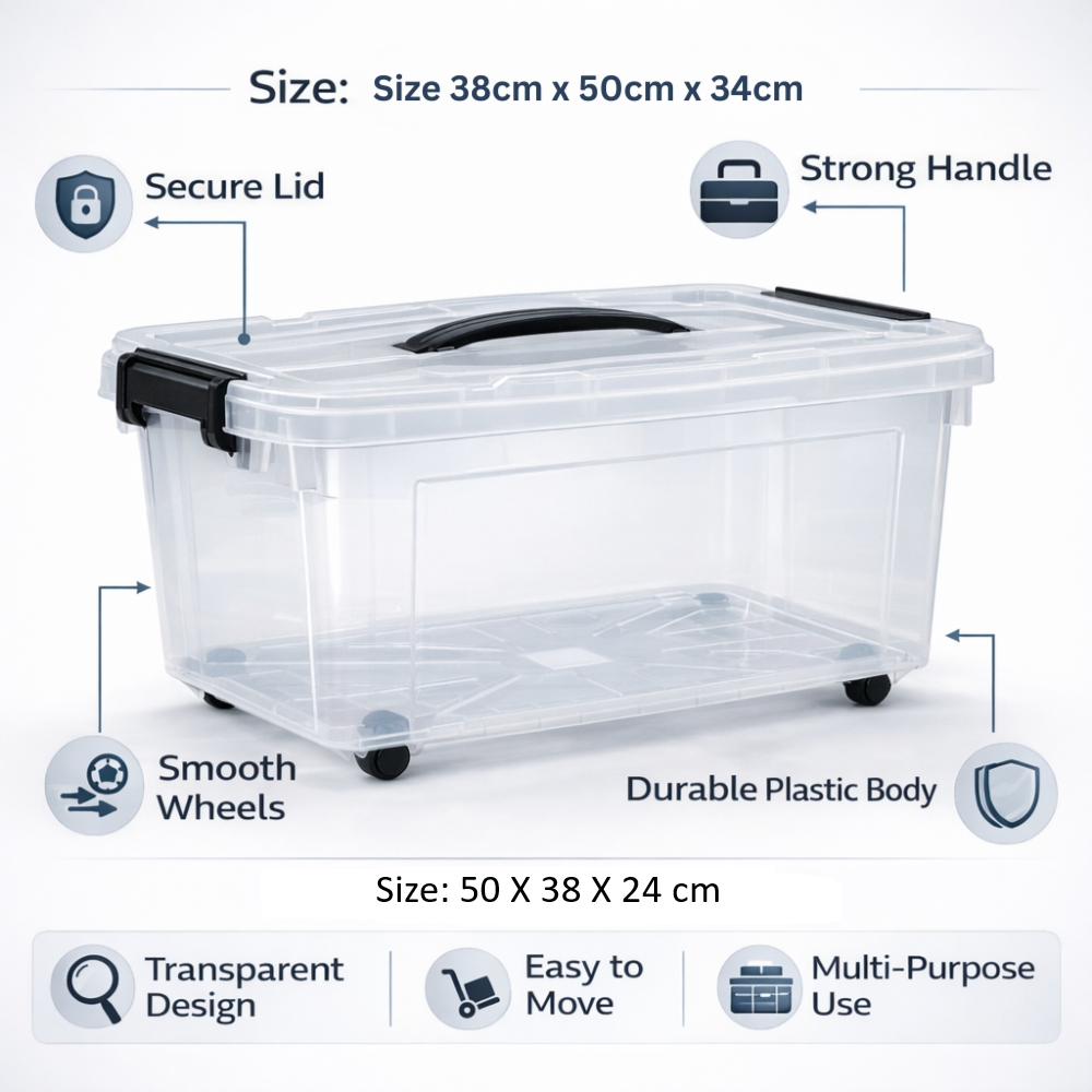 Large 50L storage box designed to keep your space organized in a practical and stylish way. Transparent body allows easy visibility, with a secure lid and strong handles for convenient use.