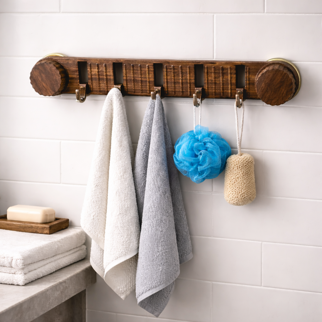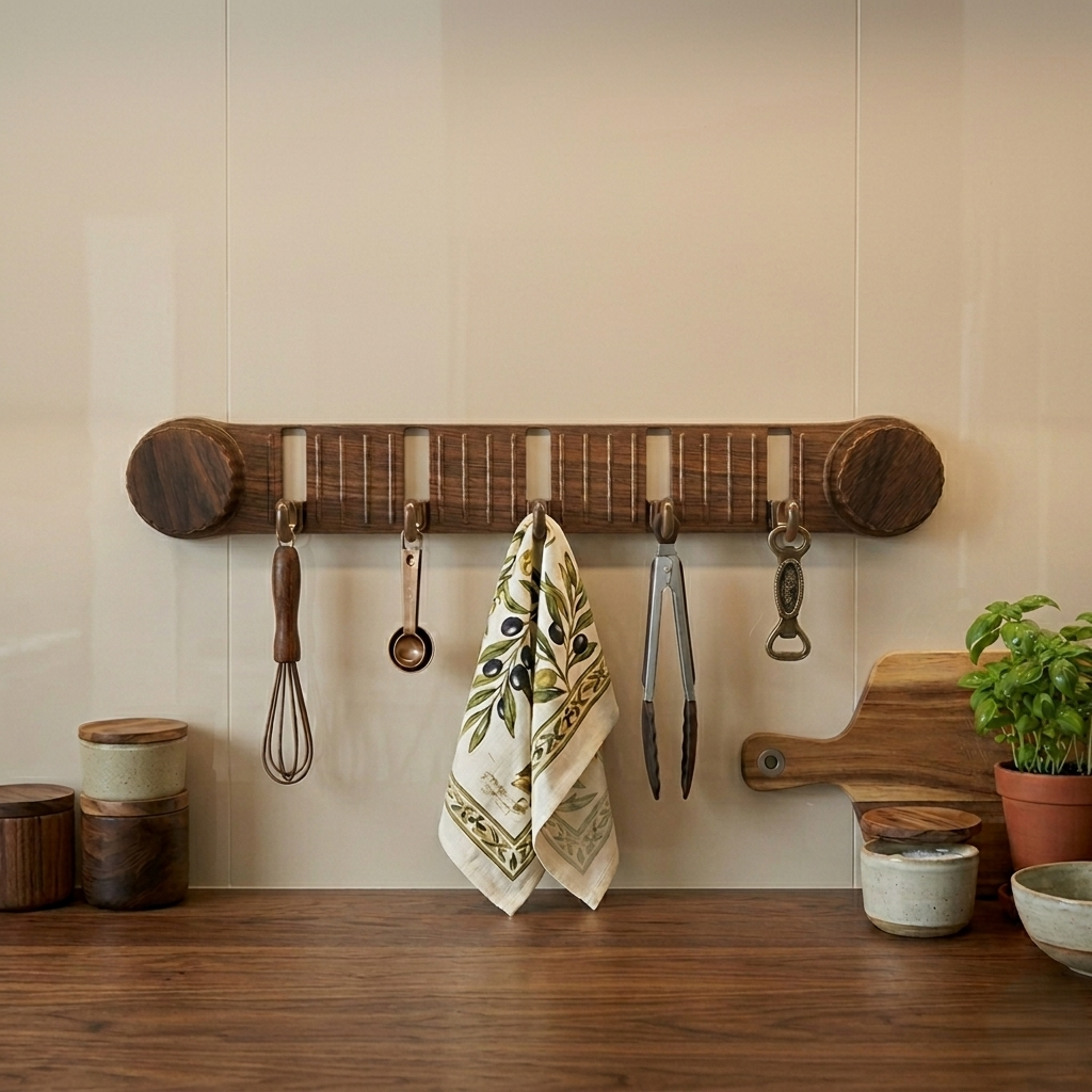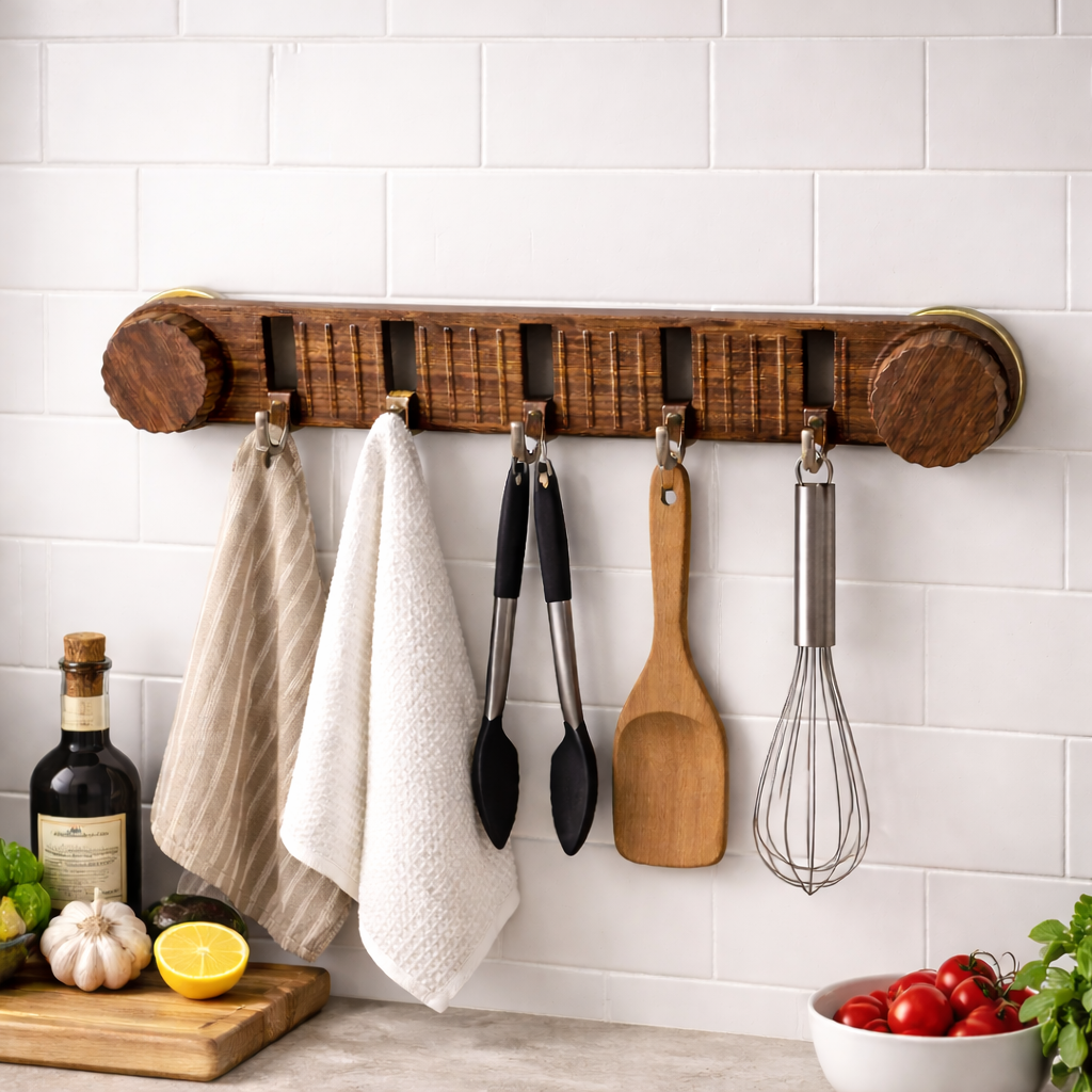A practical wall-mounted rack with multiple hooks for organizing and hanging everyday items. Designed with a combination of wood-style finish and metal hooks, making it suitable for kitchens, bathrooms, or any organized space.