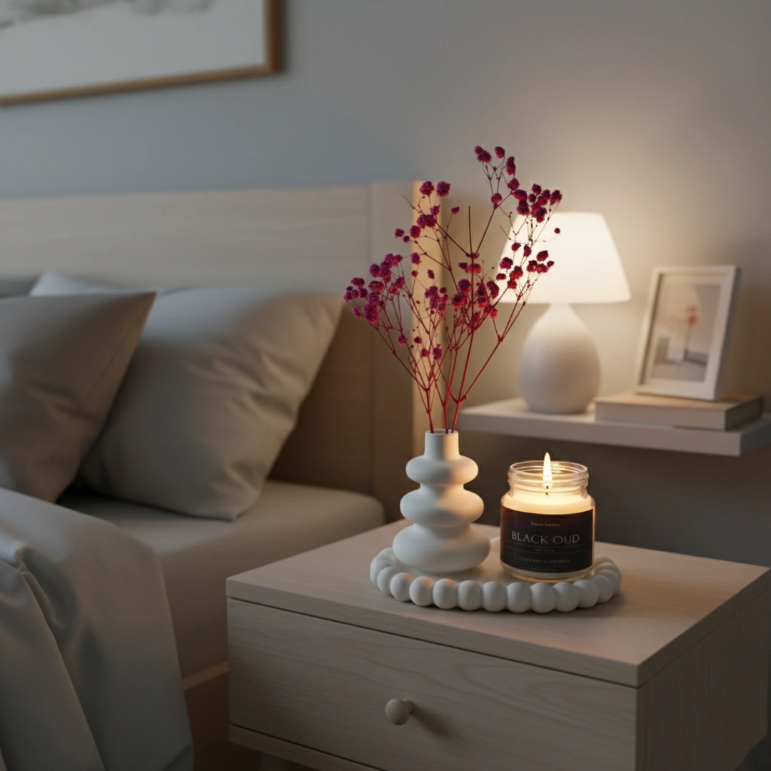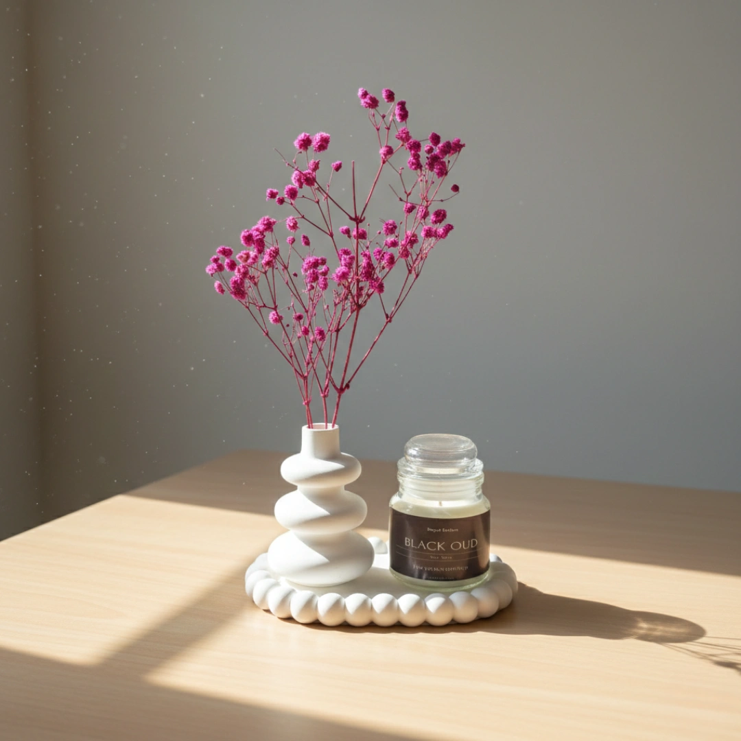 Features refined decorative pieces paired with a scented candle crafted from natural, eco-safe oils.